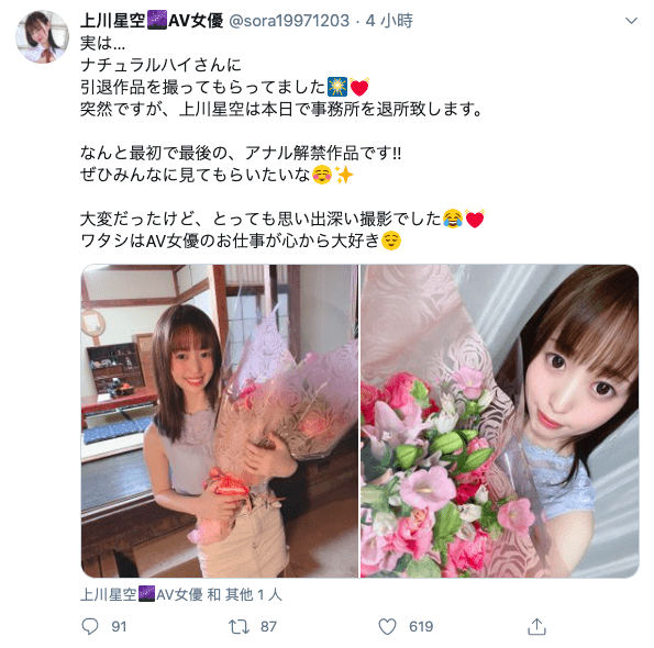 同样是企划女优的上川星空在三小时前突然告诉大家「今天去拍了告别作」,现在已经退出事务所不再是AV女优。只是在大家错愕的同时上川星空也提前曝光了引退作的彩蛋:在片商ナチュラルハイ(Natural High)的安排下她进行了最初也是最后的解禁,开放后门让男优进出~