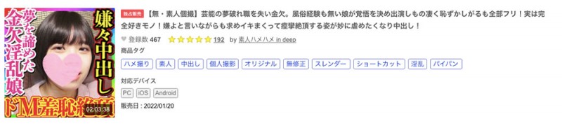 番号是FC2-PPV-2607627,从标题来看这是一个来到东京想加入演艺圈结果西方失败的可怜女孩,钱花完了,梦想也破灭了,为了活下去,没有风俗经验的她只好和无码卖家合作,在FC2发片出鲍⋯